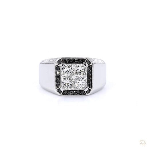 A modern statement in 18K white gold, this men’s ring showcases a cluster of princess-shape white diamonds framed by bold black diamonds. Sleek yet powerful, it’s designed for elegance— perfect for marking milestones, celebrating achievements, or elevating everyday style.