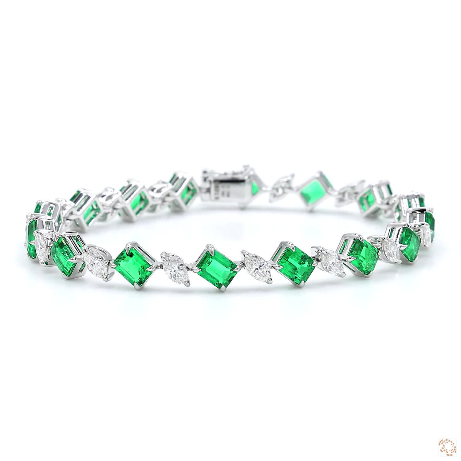 This classic design features 16 exquisite deep-muzo green emerald-cut Colombian green with exceptional clarity, combined with 16 marquise-cut diamonds, set in 18K White Gold. The combination of the green emerald and the diamonds creates a timeless design around your wrist. This diamond and emerald bracelet is an ideal gift for those who are looking for a perfect fusion of luxury and style,