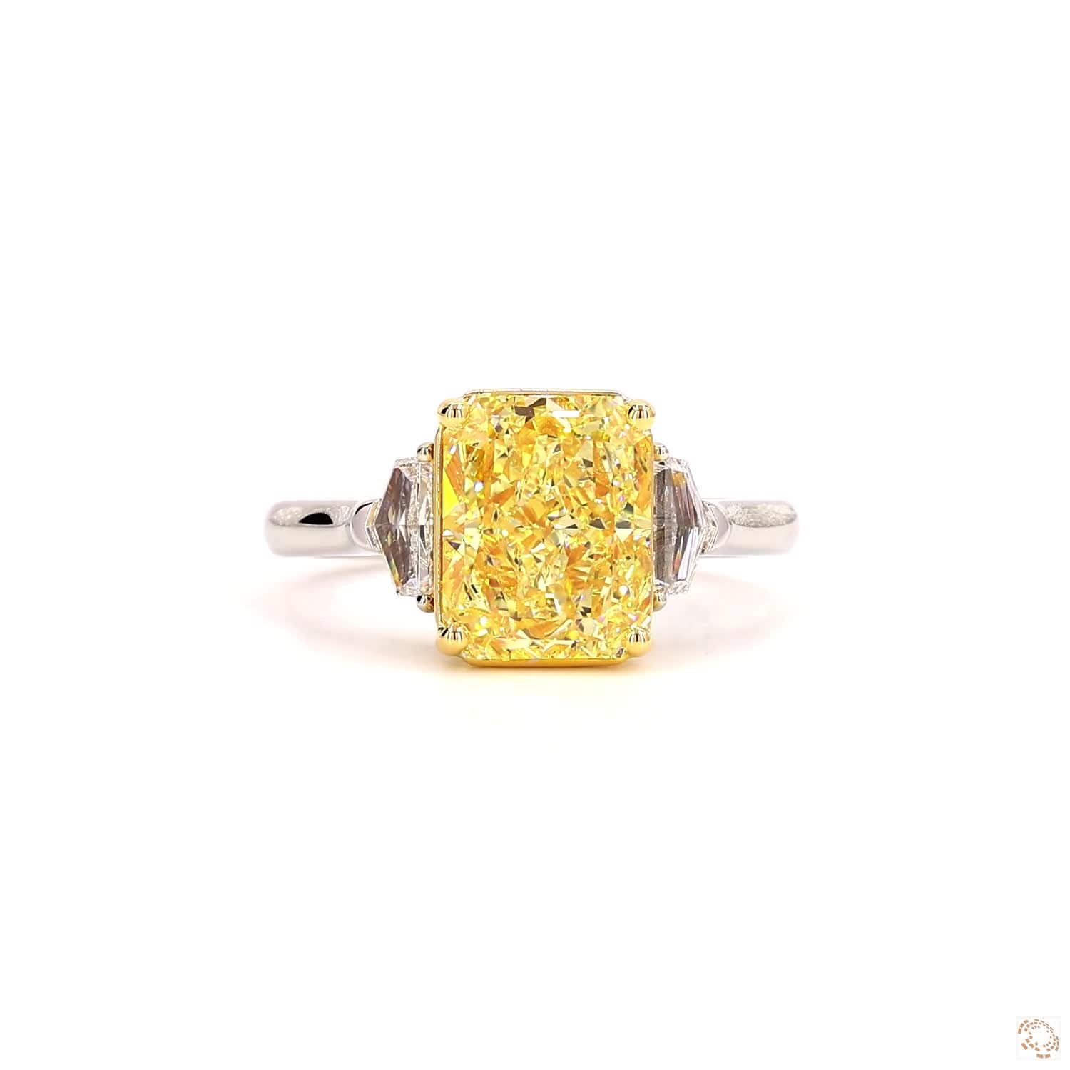 This Three Stones Radiant Fancy Yellow Diamond Ring pairs timeless elegance with vibrant color. A 3.30ct radiant-cut fancy yellow center diamond is secured by rounded prongs and set against a sleek 18K white and yellow gold band. Perfect for adding a joyful glow to special celebrations or as a treasured gift.
