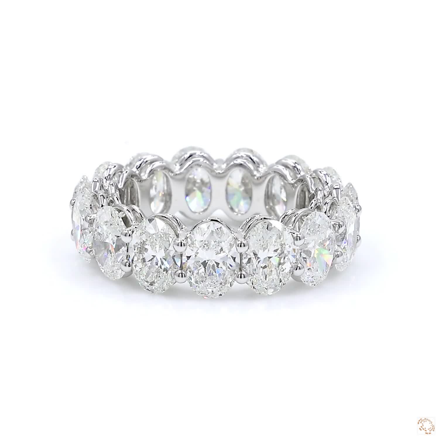 This full eternity band is adorned with 7.55 carats of oval-shape natural diamonds, each approximately 0.50 carats, secured in a shared prong setting for maximum brilliance. Set in 18K white gold, the elongated shape of the diamonds enhances the finger’s silhouette, making it a stunning gift for a milestone celebration or a luxurious addition to your jewelry collection.
