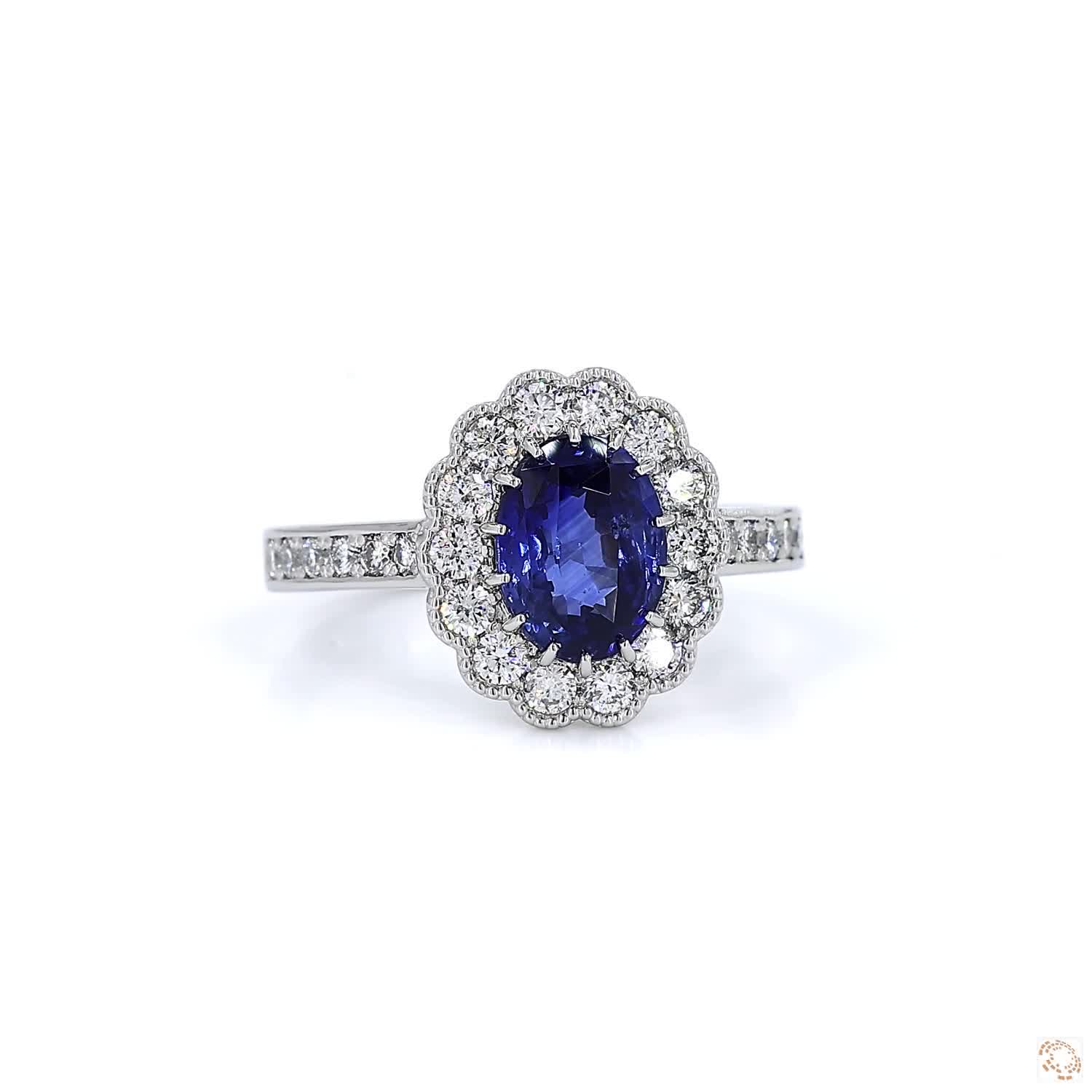 Set within a modern millgrain frame and in Platinum, this engagement ring features an oval blue heated sapphire accented by a halo of diamonds. The precise edges and clean design make a bold yet elegant engagement ring or a timeless gift.