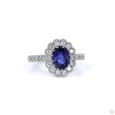 Blue Sapphire and Diamond Halo Platinum Ring