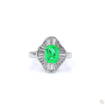 Crafted in platinum, this ring features a 1.27-carat certified Colombian emerald, framed by 0.92 carats of natural diamonds. The Colombian emerald’s rich deep green hue is complemented by the brilliance of natural baguette diamonds, creating a refined balance of color and light. Designed with precision and authenticity, it stands as a distinguished piece for collectors and connoisseurs alike.