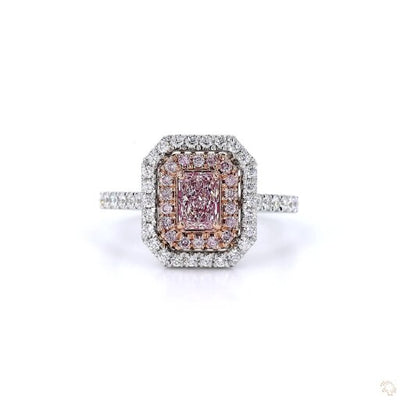 Set in 18K white gold, this ring features a 0.51ct radiant-cut natural pink diamond, surrounded by a double halo of fancy light pink and white diamonds. Bold yet elegant, it makes a striking engagement ring or a timeless gift.