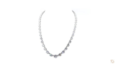 This 18K white gold Riviera tennis necklace has a total diamond weight of 25ct. The carefully balanced design offers a refined, contemporary look that transitions effortlessly from special occasions to everyday wear. A versatile piece, it brings understated luxury to any collection.